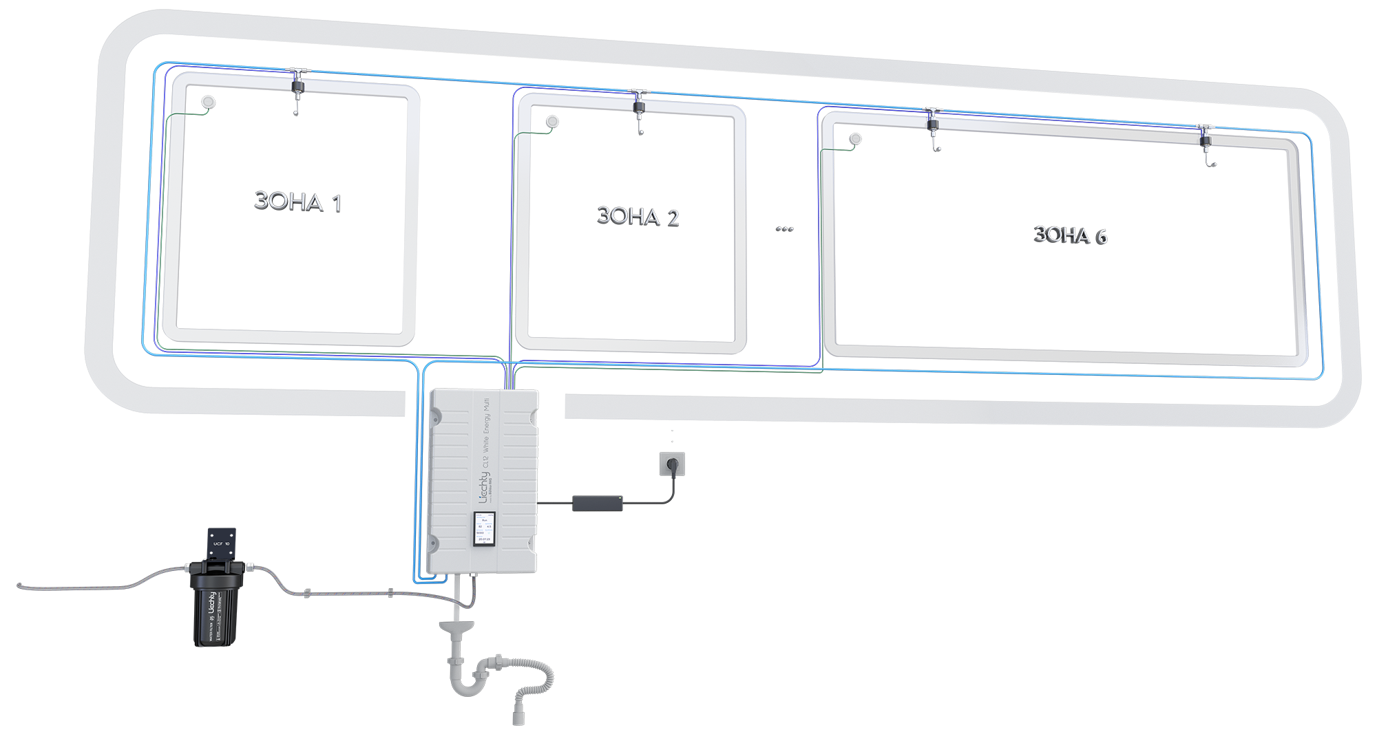 Перед центральным модулем устанавливается внешний фильтр или комплект фильтров, модель зависит от качества входной воды. Вода после фильтра проходит тонкую очистку двухпроходным обратным осмосом, а также объемную ультрафиолетовую дезинфекцию внутри центрального модуля. Магистраль высокого давления строится по кольцевой архитектуре, а форсунки монтируются на тройники.